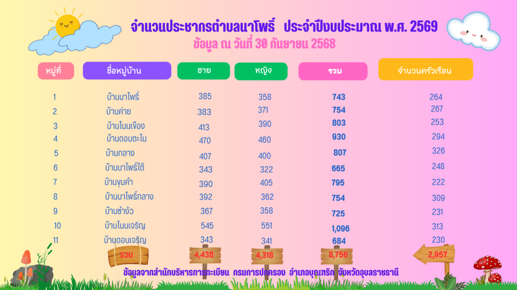 หมายเหตุ : ข้อมูล ณ วันที่ 30 กันยายน 2568 จากสำนักบริหารการทะเบียน กรมการปกครอง อำเภอบุณฑริก จังหวัดอุบลราชธานี