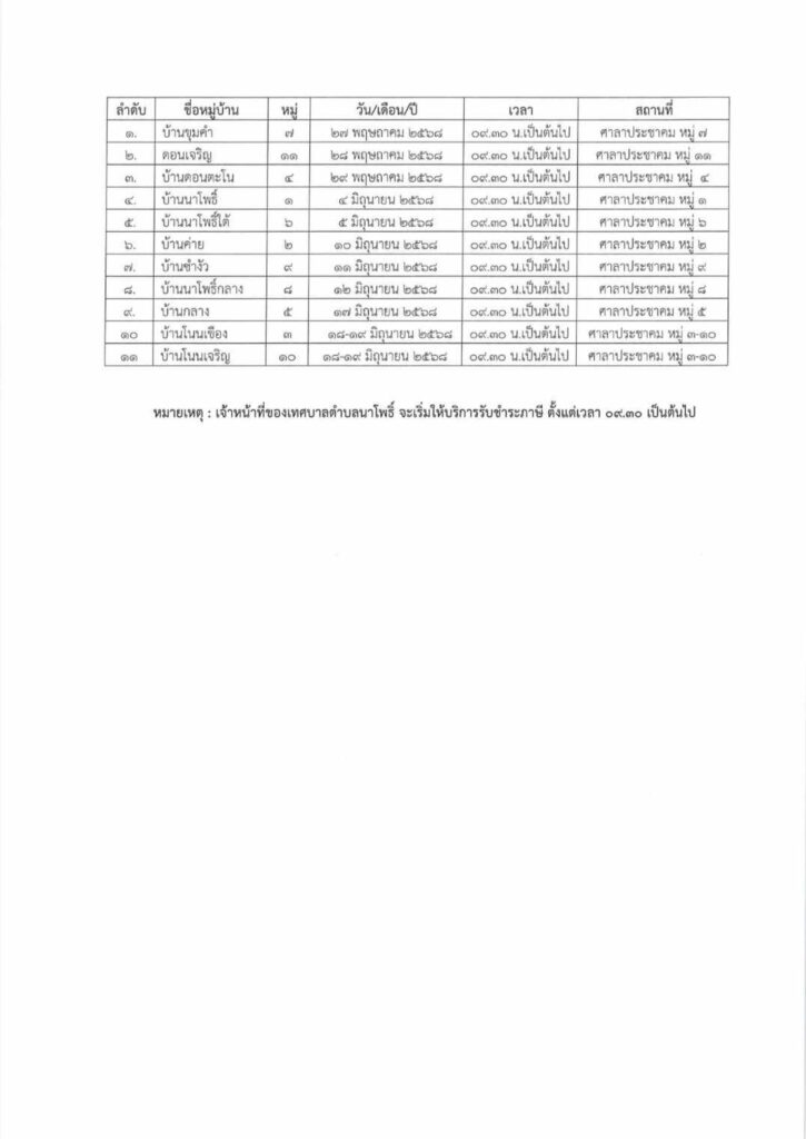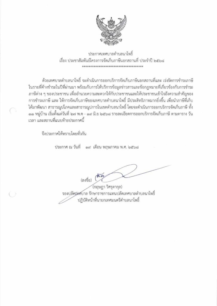 ประกาศเทศบาลตำบลนาโพธิ์ เรื่อง ประชาสัมพันธ์โครงการจัดเก็บภาษีนอกสถานที่ประจำปี 2568 21 พฤษภาคม 2025 วนัชยา ข่าวกองคลัง, ข่าวประชาสัมพันธ์ ดูทั้งหมด : 92 ประกาศเทศบาลตำบลนาโพธิ์ เรื่อง ประชาสัมพันธ์โครงการจัดเก็บภาษีนอกสถานที่ประจำปี 2568 โดยจะออกบริการเก็บภาษีนอกสถานที่ทั้ง 11 หมู่บ้าน เริ่มตั้งแต่วันที่ 27 พฤษภาคม- 19 มิถุนายน 2568 รายละเอียดตามเอกสารที่แนบท้ายนี้