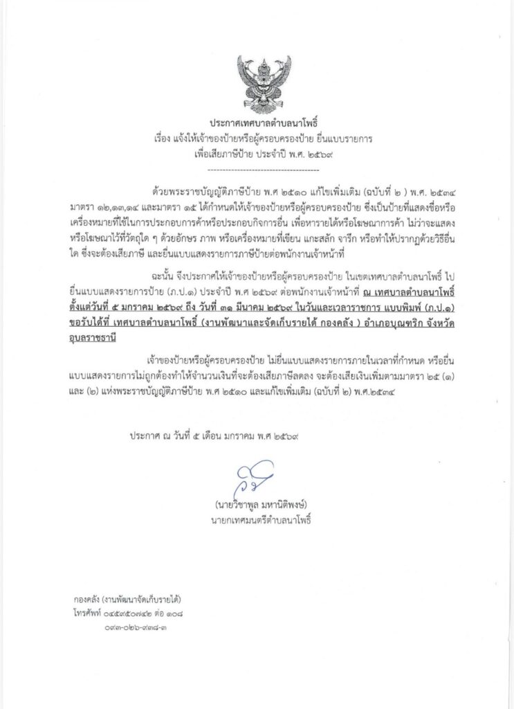 ประกาศเทศบาลตำบลนาโพธิ์ เรื่อง แจ้งใหัเจ้าของป้ายหรือผู้ครอบครองป้าย ยื่นแบบรายการเพื่อเสียภาษีป้าย ประจำปี พ.ศ.2569 ได้ตั้งแต่วันที่ 5 มกราคม2569 ถึง 31 มีนาคม 2569 ในวันและเวลาราชการ โดยขอรับแบบได้ที่ งานพัฒนาและจัดเก็บรายได้ กองคลัง 13 มกราคม 2026 คุณปู่วัยทอง ที่ยังไม่ยอมแก่ ข่าวกองคลัง, ข่าวประชาสัมพันธ์ ดูทั้งหมด : 76